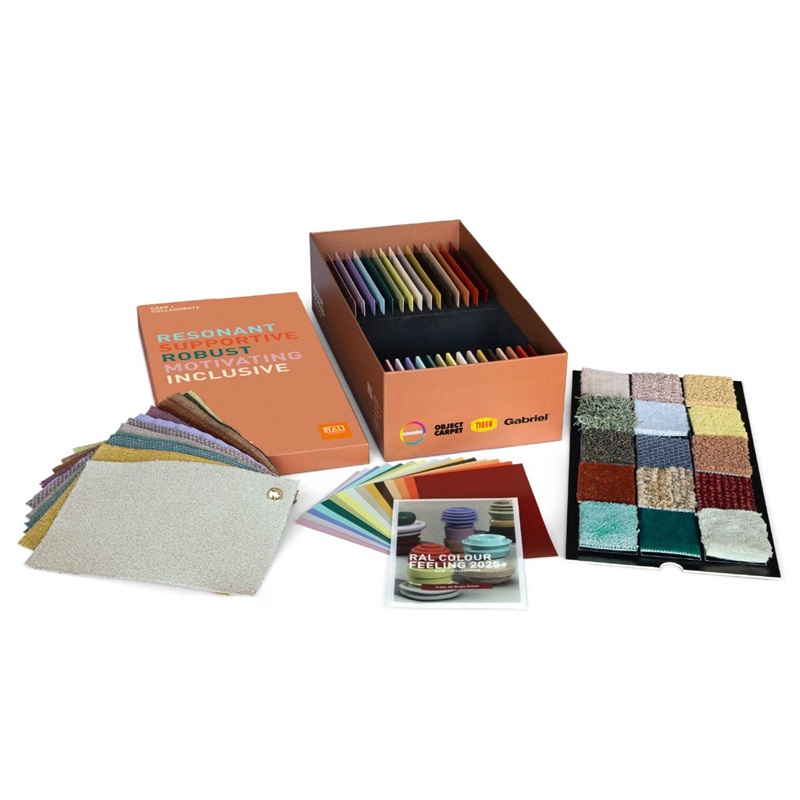 - RAL 趨勢盒是一個設計盒,包含趨勢報告 RAL COLOR FEELING 2025+ 的所有 15 種顏色,呈現效果色至5 種不同的材料 。